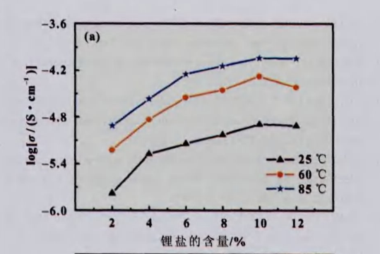 图 3 是C-10和 C50-10样品离子电导率的比较 。 在锂盐含量均为10%时 , 无 2一氰 基 乙醚增 塑剂 的SPE电导 率为2.57x10-8S/cm(25 ℃),添加质量分数为 50% 2一氰基乙醚增塑剂的 SPE电导率为 1.28x10-5S/cm (25℃ ),2一氰基 乙醚增塑剂 的加入使室温下 SPE 电导率提升 约 3个 数量级 。 根据 图2 的数据可以计算 得出 C-10和 C50-10离子 传导 活化能 (图4)。 显然增 塑剂的加入降低了 离子传导活化能,增大了离子传输能力 ,提高了SPE膜的离子电导率。