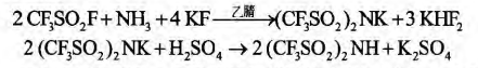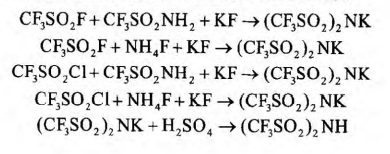 另外开发了通过三氟甲磺酰氟或三氟甲磺酰氯与三氟甲磺酰胺和碱金属氟化物反应合成双三氟甲基磺酰亚胺碱金属盐,再酸化得到 双三氟甲基磺酰亚胺。