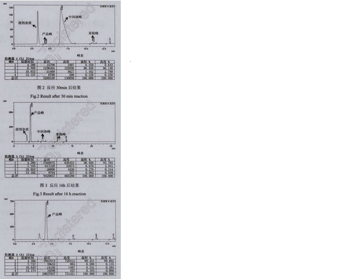 为了证明这一问题,重复这一反应。并在30min后取样进行液相色谱分析(图2),16h、20h后分别再次取样进行液相色谱分析(图3、4)。由色谱图可以看出,当反应30min后,原料苯胺几乎反应完全,主要转化为中间体,但是产物的量较少。而16h后,中间体逐渐转化为产物,但仍然由部分未转化完全。直至20h,反应完全。这结果证实了之前的推测,符合反应机理的预测结果。反应一、二都是典型的双分子亲核取代(SN2)反应,这类反应的速控步是亲核试剂亲核进攻过程。由于反应一的亲核试剂苯胺的反应活性较高,反应一的速率较高,放热剧烈。而反应二的原料(中间体)由于被三氟甲磺酰基取代,氮原子的酸性增强、电子云密度降低,亲核能力大大降低,因此反应二速率也会大大降低。为了提高反应效率,必须提高反应二的